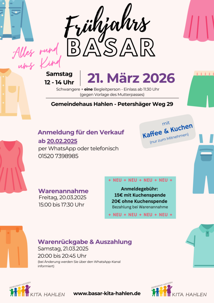 AKTUELLES Frühjahrsbasar 2026 21.03.2026 von 12 – 14 Uhr Gemeindehaus HahlenPetershäger Weg 2932427 Minden